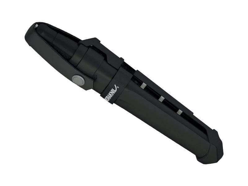 Couteau Mora Garberg Multi Mount black. Lame drop point de 10.8cm en acier carbone, coating de protection noir. Manche en polyamide noir texturé. Full tang. Etui multi-support compatible Molle.