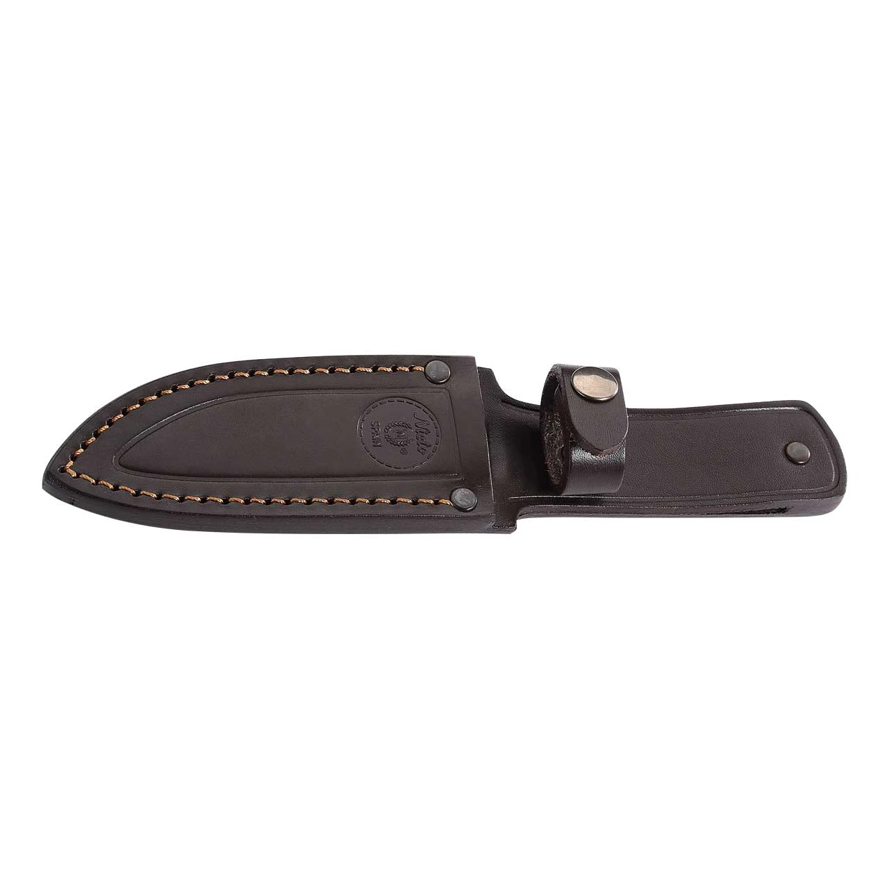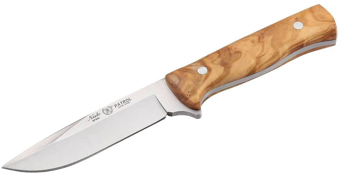 Couteau Nieto Patrol. Lame de 11.2cm en acier inox, plate semelle. Manche en olivier. Longueur totale 22.8cm. Etui cuir brun. Poids 194g (couteau seul).