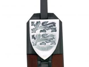 Couteau Normand. Lame de 8.5cm en acier inox Z100. Manche de 10.5 cm en pommier, ressort guilloché avec mouche décorée avec blason de la Normandie, mitres en maillechort. Cran forcé. Poids 99g.