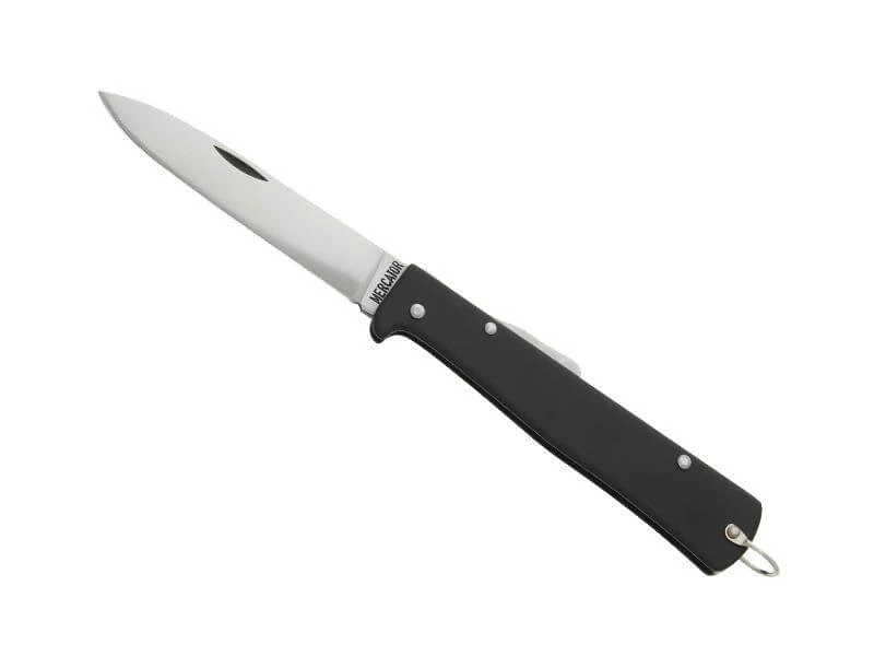 Couteau OTTER « MERCATOR », lame acier carbone XC75 avec cran au dos, manche 11 cm métal noir, avec bélière. Manche en acier plié (plus vieux couteau de ce type produit dès 1867). Emblème original du chat bondissant embouti en peinture dorée. Longueur totale 20cm. Poids 70g. Ce couteau a été largement utilisé par les soldats allemands au XIXème siècle et était considéré comme une arme de la dernière chance lors de combats au corps à corps. Le premier K est pour l’adresse de la fabrique (Kaufmann), le 55 pour le numéro de la rue et le 2ème K pour Katz comme chat.