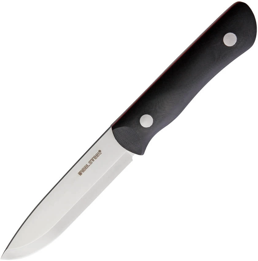 Couteau Real Steel Bushcraft III avec lame finition satinée de 10cm en acier D2 tool semi-inox. Manche en G10 noir avec intercalaires rouges. Full tang. Gaine de ceinture en kydex noir avec attache amovible pour la ceinture. Longueur totale 21.5cm.
