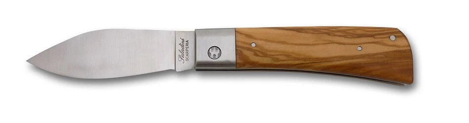 Saladini Caccia Mugellano olivier. Lame de 8.4cm. en acier inox Ma5MV. Manche en bois d’olivier. Ressort guilloché. Cran forcé carré. Longueur totale 19cm. Livré dans un coffet en bois et avec une pochette en tissu. L’axe de la lame représente le campanile de Scarperia, symbole du village.