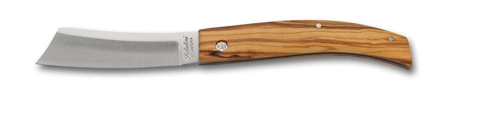 Saladini Rasolino olivier. Lame de 8.4cm. en acier inox Ma5MV. Plein manche en olivier. Cran forcé carré. Ressort guilloché. Longueur totale 19.4cm. Couteau italien. Livré avec un coffret en bois et une pochette en tissu. L’axe de la lame représente le campanile de Scarperia, symbole architectural du village.