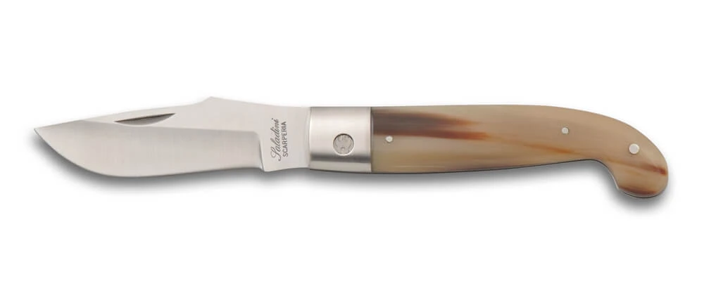 Couteau Saladini Zuava. Lame de 8cm. en acier inox  Ma5MV. Manche en corne de vache. Mitres en acier inox brossĂ©. Cran forcĂ© carrĂ©. Longueur totale 19cm. FabriquĂ© Ă Scarperia dans la rĂ©gion de Florence. LivrĂ© avec un coffret en bois et une pochette. Lâaxe de la lame reprĂ©sente le campanile de Scarperia, symbole du village. Par rapport Ă la photo du site, la corne peut varier lĂ©gĂšrement de teinte selon les modĂšles en stock.