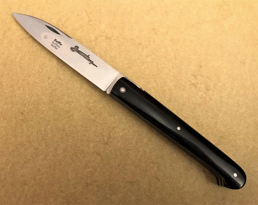 Couteau Sauveterre 11cm avec lame acier inox de 9.2cm. Plein manche en corne de buffle. Cran forcé. Couteau de l’Aveyron produit par Laguiole en Aubrac (photo non contractuelle).