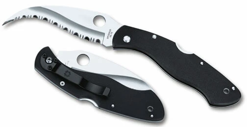 Couteau Spyderco Civilian. Lame de 13.65cm en acier inox VG-10 recourbée et dentée. Manche en G-10 space-age laminé. Clip noir. Cran à pompe. Livré en pochette zip.