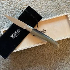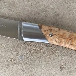 Lame en acier 12C27 inox de 9 cm. Manche en bouleau, mitre inox satinée, Ressort guilloché.
