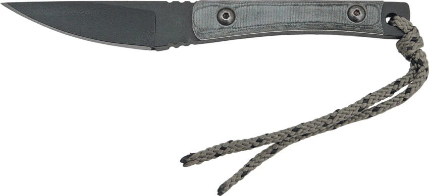 Lame de 6.3cm en acier 1095 avec coating noir. Manche en micarta noir linen. Etui en kydex avec clip acier pour la ceinture. Longueur totale 17.6cm. Livré avec petit aiguiseur de poche.