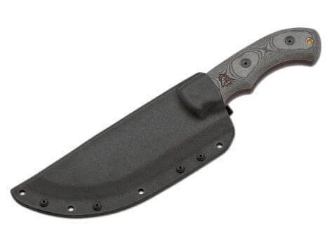 Lame de 16cm en acier 1095 black coated. Manche en micarta. Etui Kydex avec 2 clips en métal pivotants. Un vrai couteau de survie pour couper, hacher, scier… Longueur totale 31cm. Epaisseur de la lame 6.4mm.