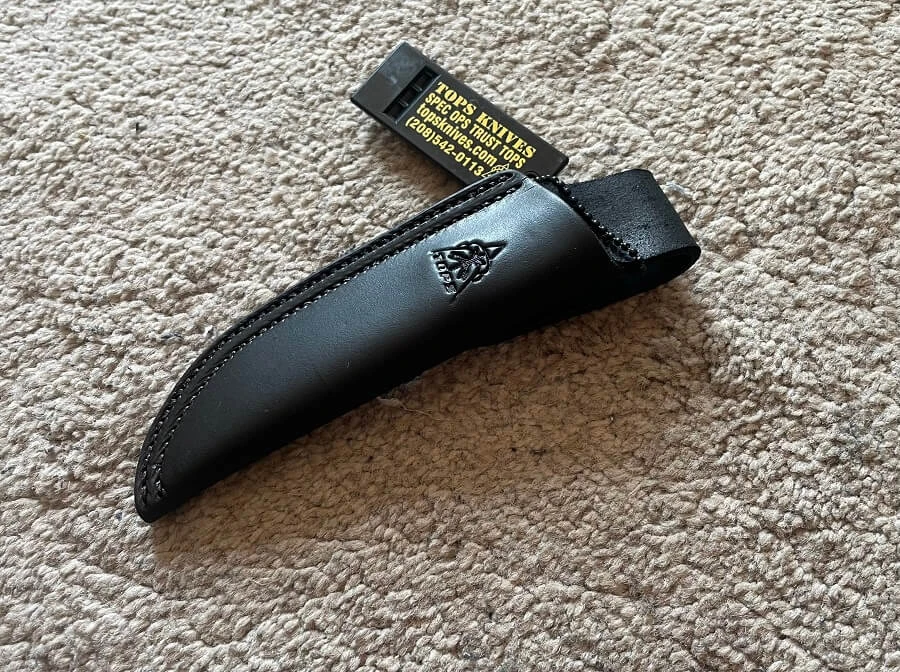 Couteau TOPS Scandi Trekker. 19,3cm. au total. Lame de 8.8cm. en acier 1095 à haute teneur en carbone de avec émouture scandi modifiée et arête pour le pouce. Pleine soie. Poignées micarta canvas vert. Trou pour une lanière. Fourreau de ceinture en cuir noir avec passant pour ceinture haut. Comprend un sifflet de survie TOPS. Certificat d’authenticité. Emballé en vrac.