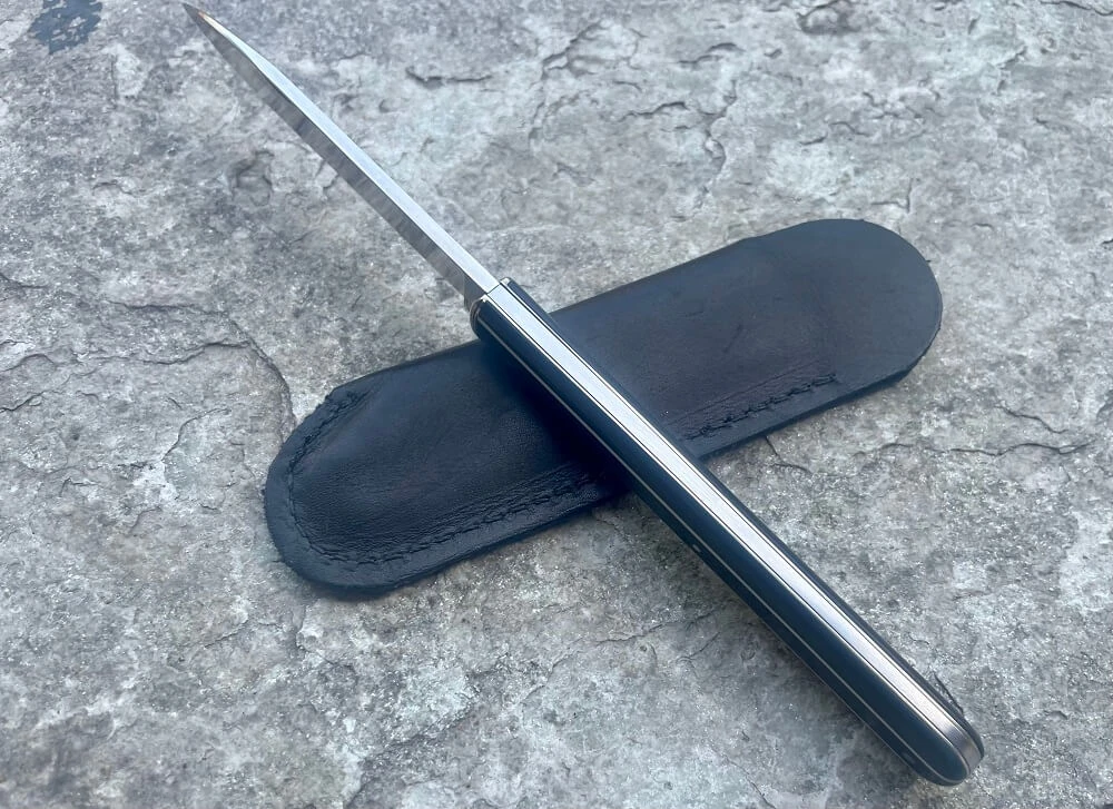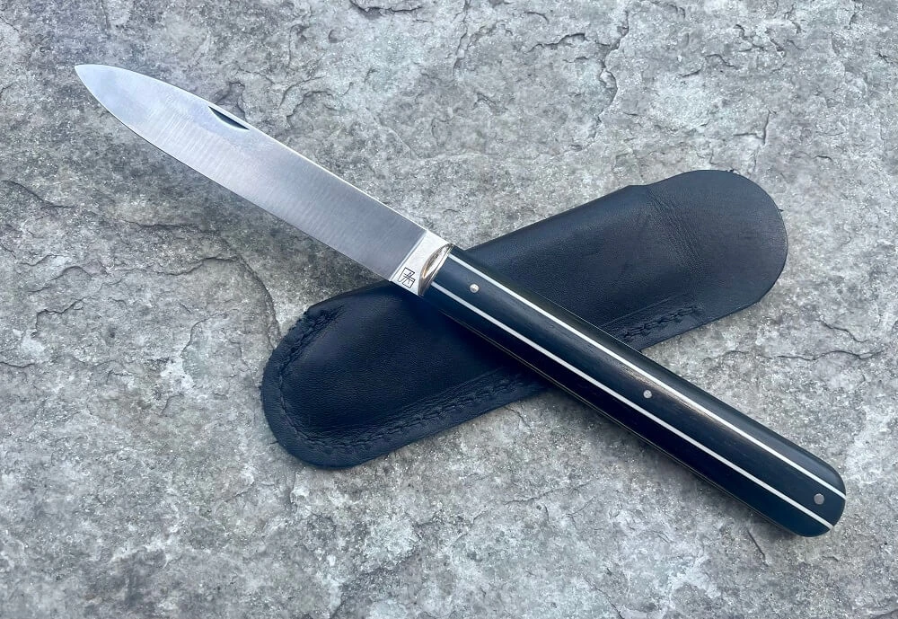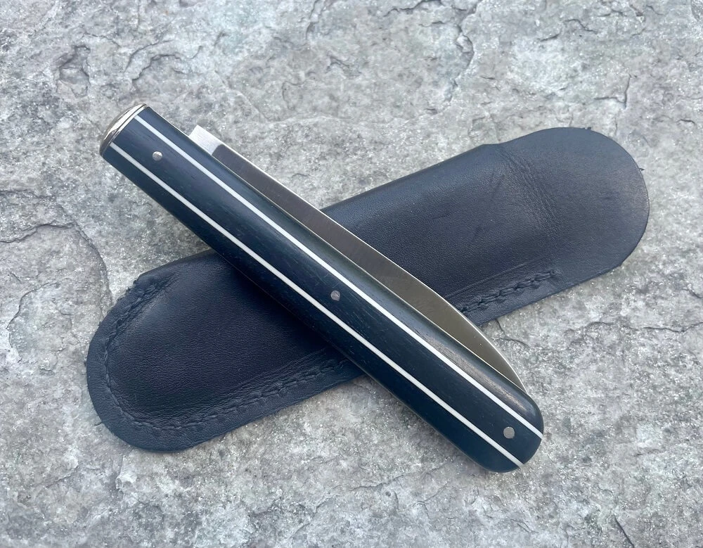 Couteaux d’Adrien Vautrin modèle Effilé. Lame de 8.9 cm en acier inox 14C28N. Manche avec plaquettes rivées en ébène incrusté d’os. Platines et ressort en acier inox. Cran forcé longueur totale 19,8cm.