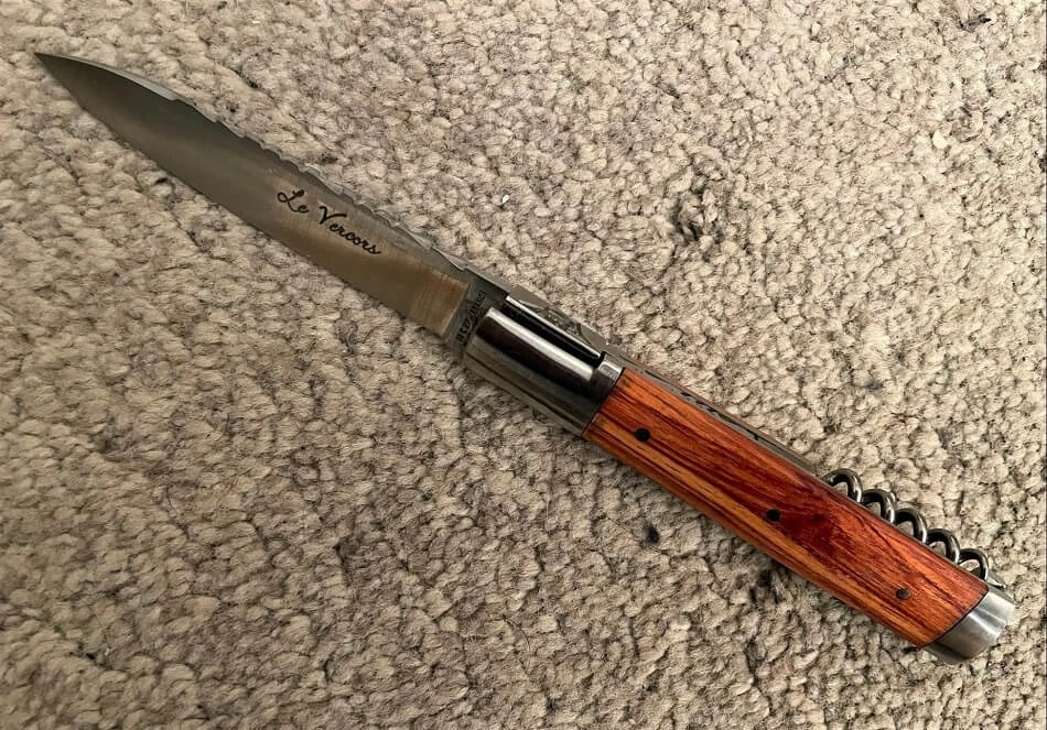 Couteau Le Vercors Vercors avec lame de 10cm en acier inox 12C27. Mitres en inox. Plaquettes en bois de rose. Cran forcé. Tire-bouchon. Longueur totale 22cm. Ressort et lame guillochés, avec Mont-Aiguille sur la mouche. Créateur François Nocca.