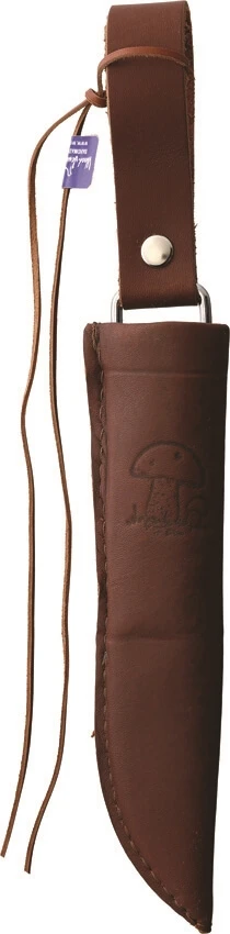 Wood Jewel couteau champignon. Longueur totale 19,69 cm. Lame en acier inoxydable finition miroir de 5,72 cm. Manche en bouleau frisé. Pommeau en corne de renne. Entretoises en corne. Brosse à champignon sur le pommeau. Gaine de ceinture en cuir marron avec dessin d’un champignon. En raison des matériaux naturels utilisés, les dimensions des couteaux peuvent varier légèrement. Emballé en vrac. Fabriqué en Finlande.
